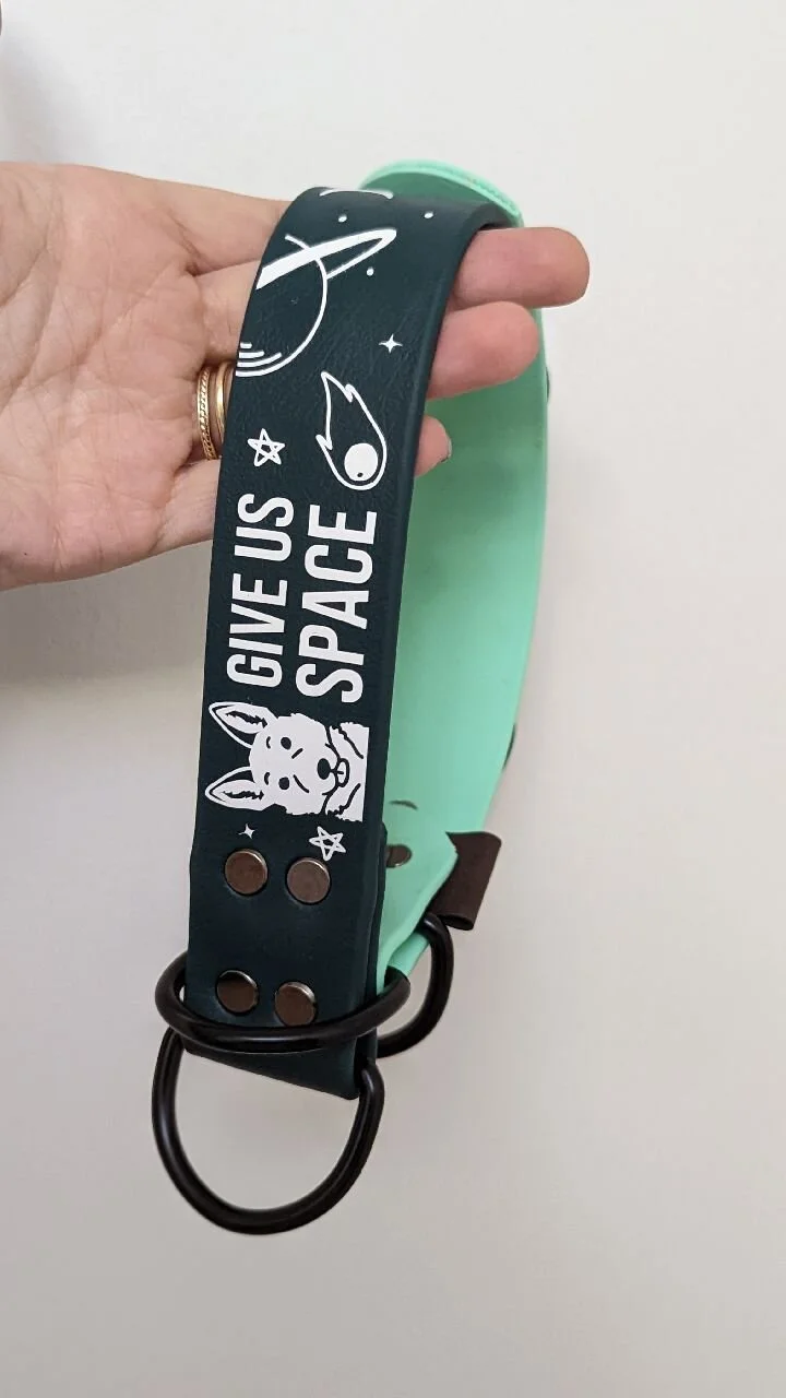 Meeko wears a black slip collar with vinyl “SpaceDog” pattern in teal